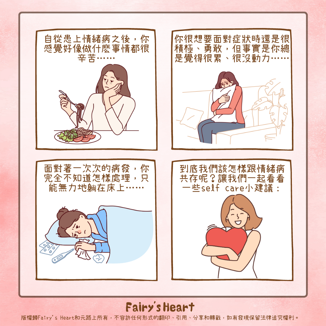 請記得,因爲患病而失去動力、不知所措、什麽都做不好的你,並不是軟弱、不夠積極或沒意志力,而是任何人面對情緒病時的正常反應。