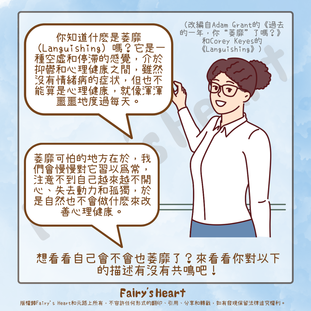 萎靡可怕的地方在於,我們會慢慢對它習以爲常,注意不到自己越來越不開心、失去動力和孤獨,於(改編自Adam Grant的《過去的一年,你“萎靡”了嗎?》和Corey Keyes的《Languishing》)是自然也不會做什麽來改善心理健康。