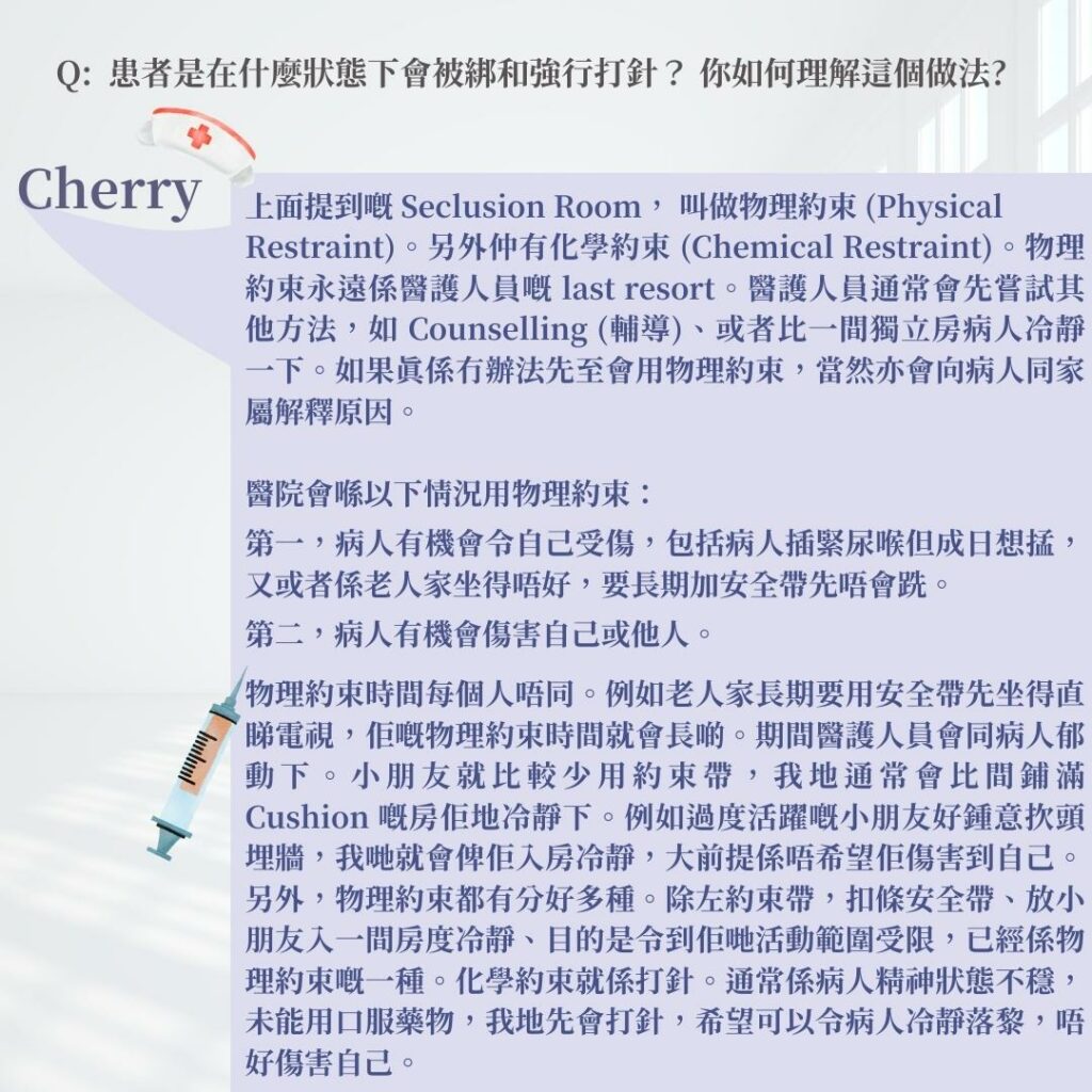 Cherry: 上面提到嘅 Seclusion Room, 叫做物理約束 (Physical Restraint)。另外仲有化學約束 (Chemical Restraint)。物理約束永遠係醫護人員嘅 last resort。醫護人員通常會先嘗試其他方法,如 Counselling (輔導)、或者比一間獨立房病人冷靜一下。如果真係冇辦法先至會用物理約束,當然亦會向病人同家屬解釋原因。